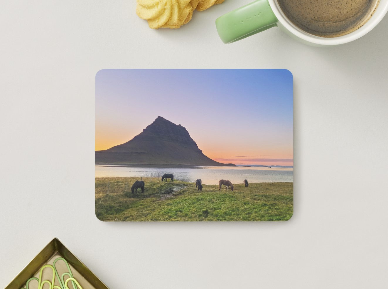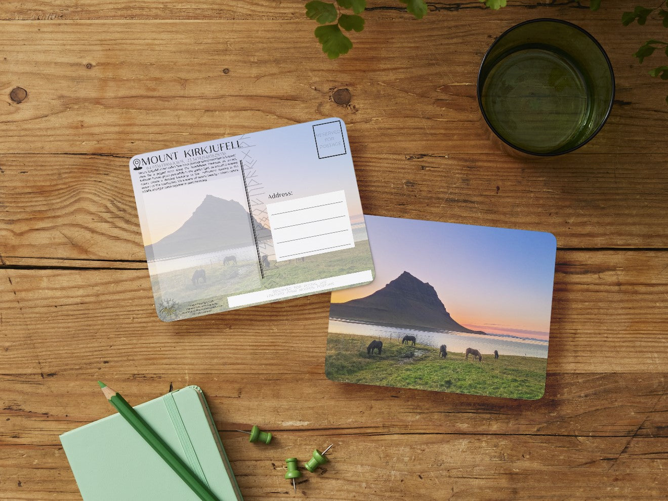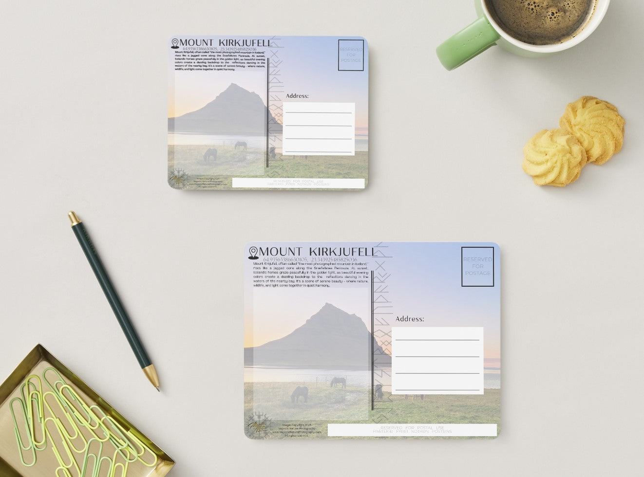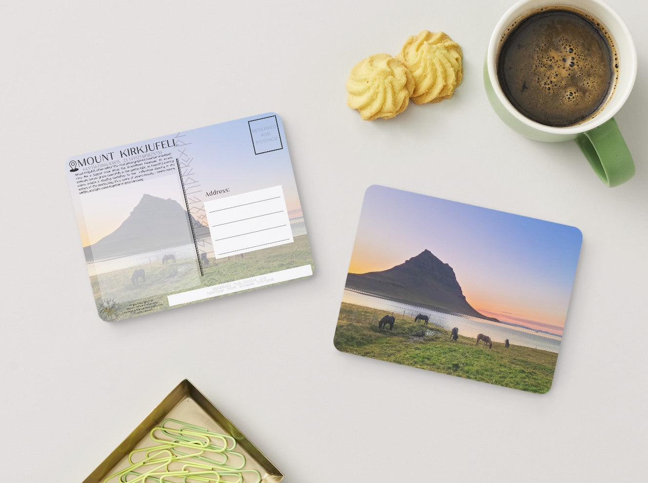 Often called “the most photographed mountain in Iceland”, Mount Kirkjufell rises like a sculpted spire from the Snæfellsnes Peninsula. At sunset, Icelandic horses graze nearby as golden light paints the sky, and reflections ripple across the still waters below. This postcard captures a peaceful harmony - where wild beauty, soft light, and timeless land meet in quiet majesty.